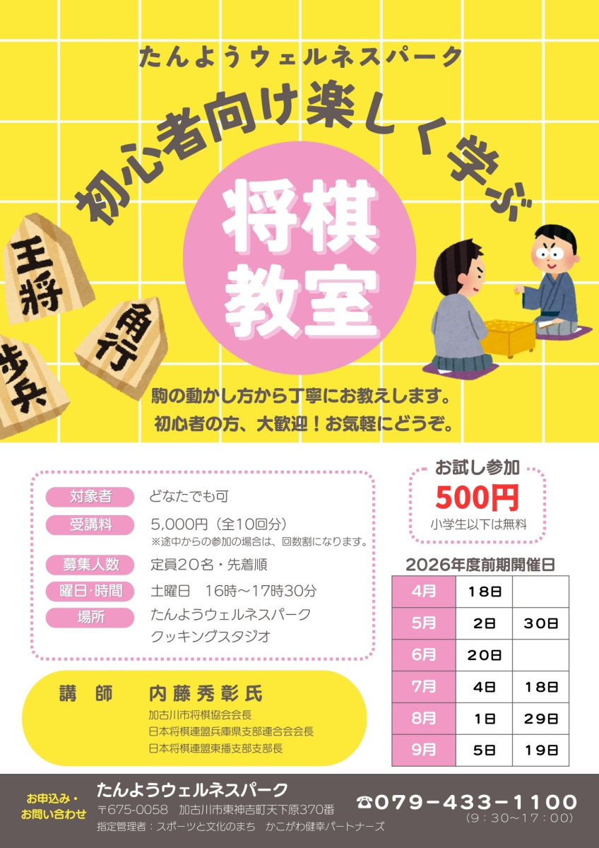 初心者向け将棋教室 2026/04/01 初心者向け将棋教室たんようウェルネスパーク日程2026-05-30 (土)時間16:00~17:30場所クッキングスタジオ価格全10回分(途中からの参加は回数割)¥5,000詳細 >