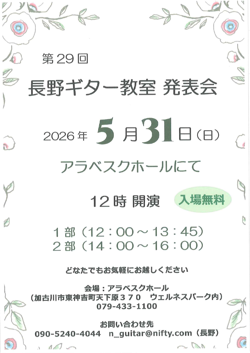 第29回 長野ギター教室 発表会 2026/04/10 第29回 長野ギター教室 発表会主催:長野ギター教室日程2026-05-31 (日)時間1部12:00~13:452部14:00~16:00価格無料詳細 >